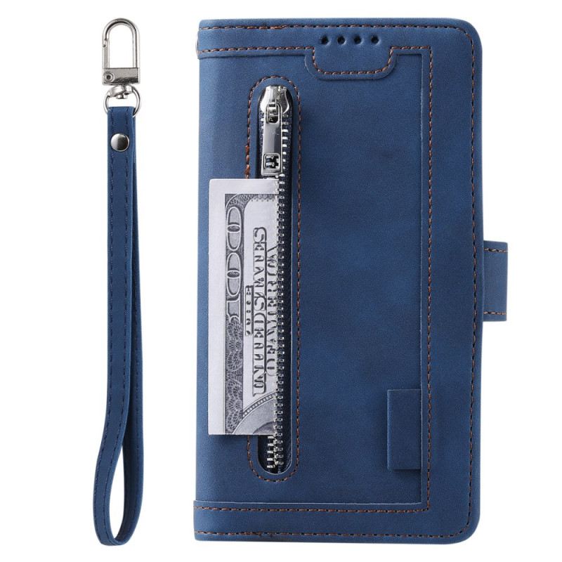 Multifunktionale Brieftasche aus PU-Leder mit 9 Kartenfächern, einem Reißverschlussfach und einer Handschlaufe. Sicherer Magnetverschluss und freihändige Standfunktion für komfortables Videostreaming.