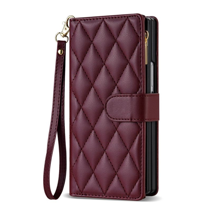 Entdecken Sie unsere stylische Brieftaschenhülle für das Samsung Galaxy Z Fold 7 5G. Hergestellt aus PU-Leder mit einem eleganten Rautensteppmuster, bietet sie hervorragenden Schutz vor Stößen und Stürzen. Mit mehreren Fächern, einem sicheren Verschluss und einem verstellbaren Ständer vereint diese Hülle Funktionalität und Stil für den praktischen Alltag. Optimaler Schutz: Gefertigt aus PU-Leder mit einer passgenauen TPU-Innenschale, bietet sie hervorragende Stoßdämpfung und Schutz vor Stürzen. Das rautenförmige Steppmuster verleiht ihr einen Hauch von Eleganz.